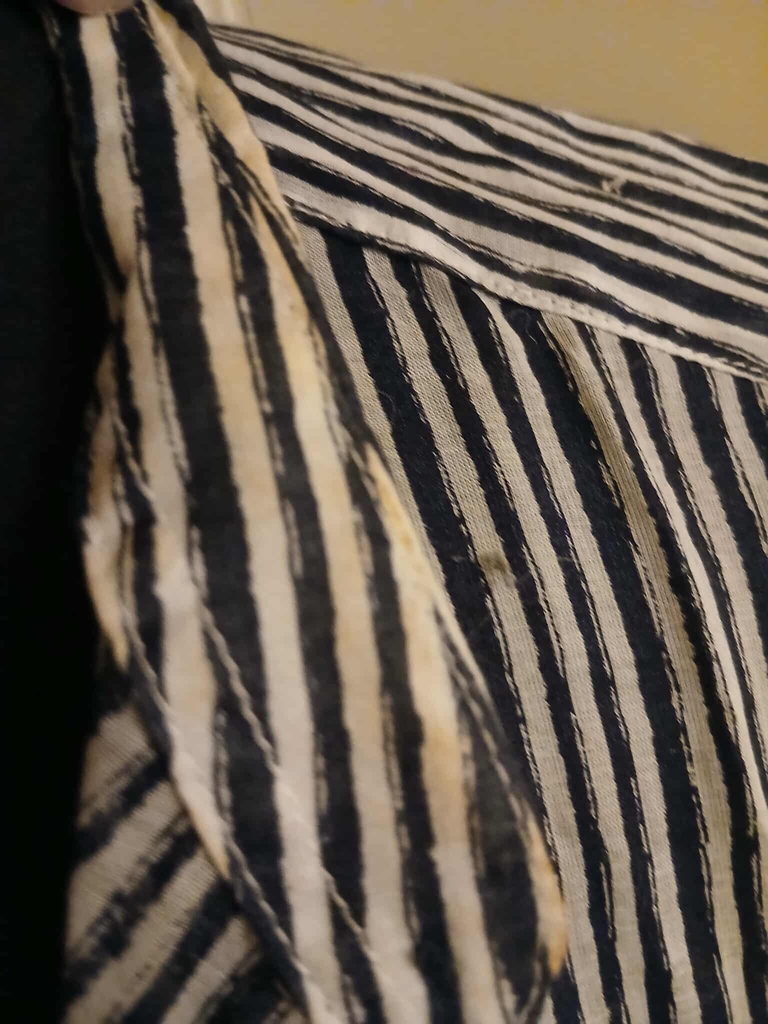 Description: Chemisier ligné bleu et blanc, très léger et légèrement transparent. 1 poche à la poitrine