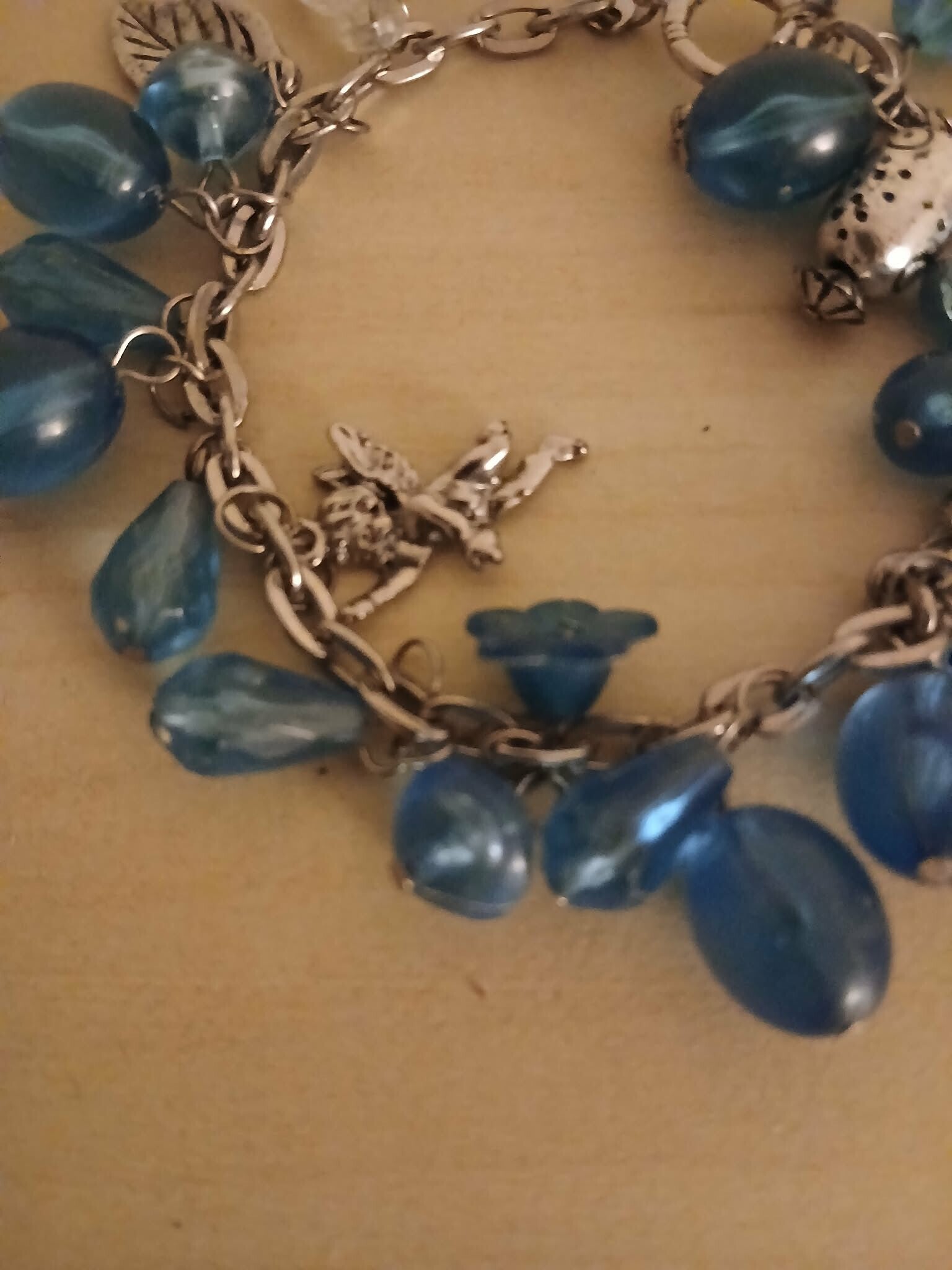 Description: Bracelet en métal avec perles en résine bleues et breloque ange.